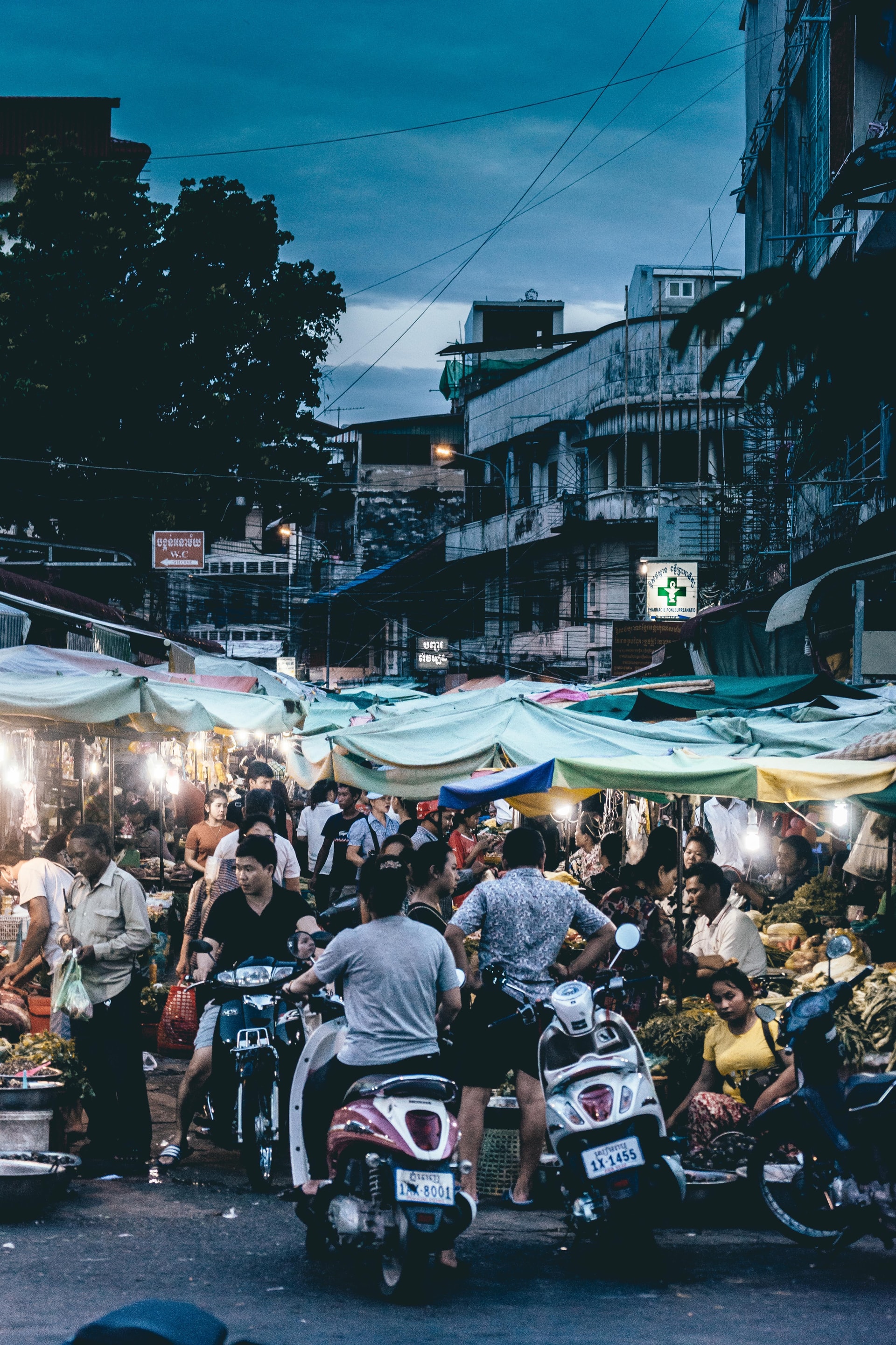 Apart from streets, markets are also pleasurable in Cambodia. Usually well-stocked and cheap, they offer the most amazing products and services. You can buy fried cockroaches, boiled eggs with a small bird inside, all kinds of electronics (usually fake), detergents, cosmetics and the like (all imported from Thailand, with the labels only in Thai, so that you can never know whether your purchase is a shampoo, a con-ditioner, or an after-shave), and clandestine copies of videotapes. Also, you can hire people to ventilate you with a fan, to carry your bags, to watch your car, and to pray for you...